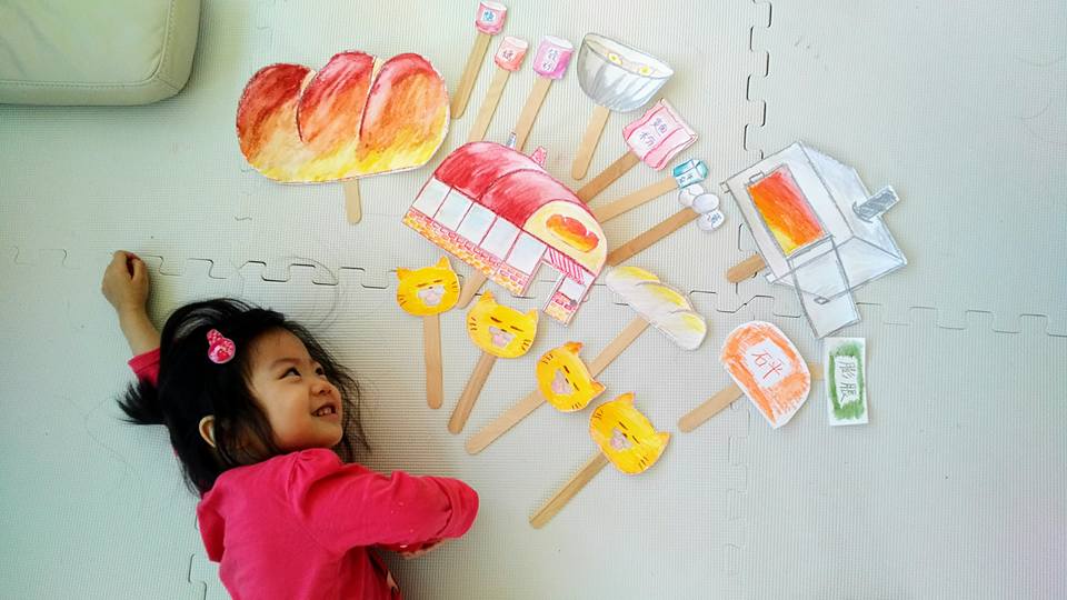 So what was it about role playing I was talking about? Why waste these pictures? Most paintings we do, I take a photo and I toss (ouch, I know many parents keep them but that isn’t possible with the amount of “trash” we produce at home). I didn’t think these should be tossed so instead, I thought of a project. I’m sure if you’re Chinese, everyone has a set of the Little Chicken Series and the same author did the Cat Series which I used for the next project. Their book 野貓軍團烤麵包 had these cute cats, bread and an exploding oven. We drew these (with my help of course) and put these on craft sticks and did roll playing retelling the story. During this whole 2 hour project the kids gained: