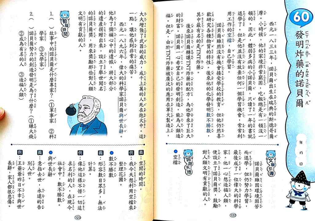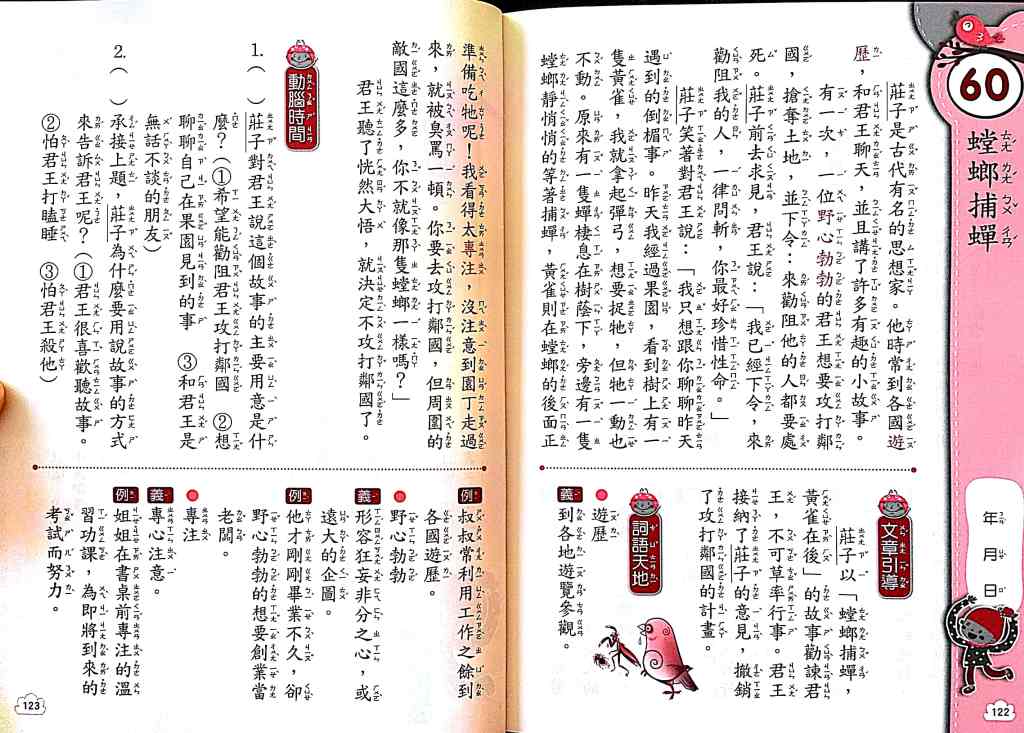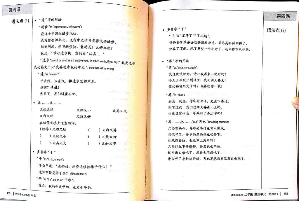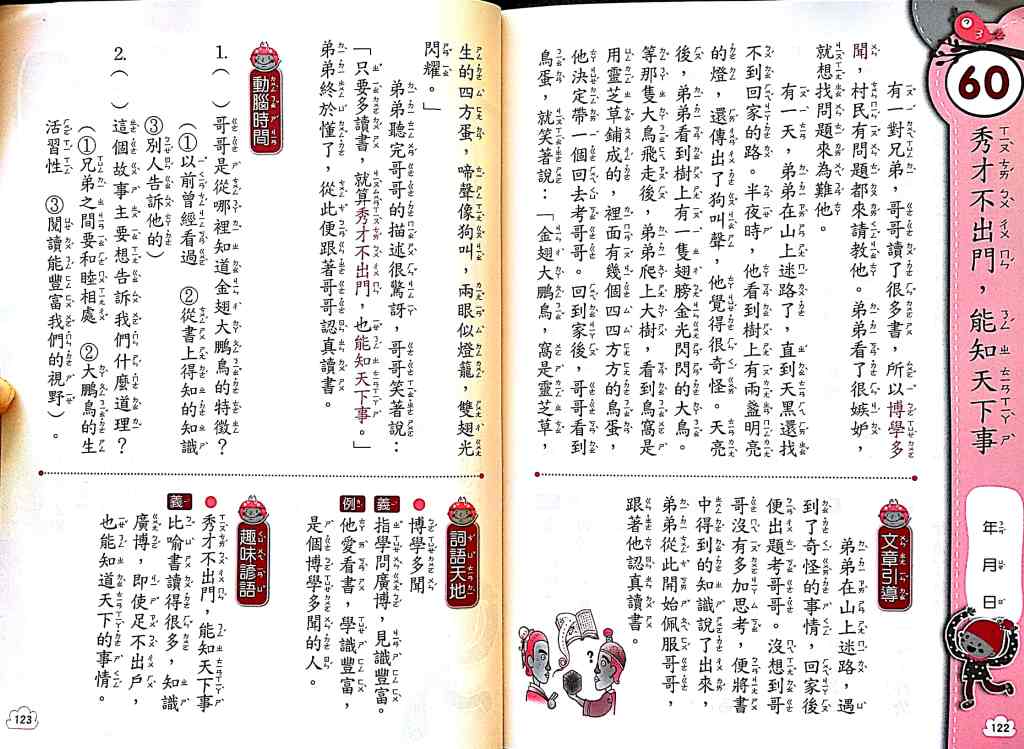 The following is supplemental main point and extra material that they have to know which is my favorite workbook that goes along with these books. This covers like one character has many sounds (一字多音), it has words that look alike, it has phrases and idioms and it’s MUCH HARDER than the actual textbook. Just going through these though, I still feel like much much more required reading outside of the text is much needed to fully understand everything. There are about 4 idioms a lesson and without using it in context, it’ll be hard to remember. Therefore, outside reading is a must.