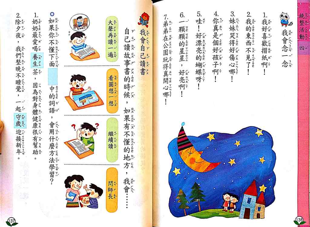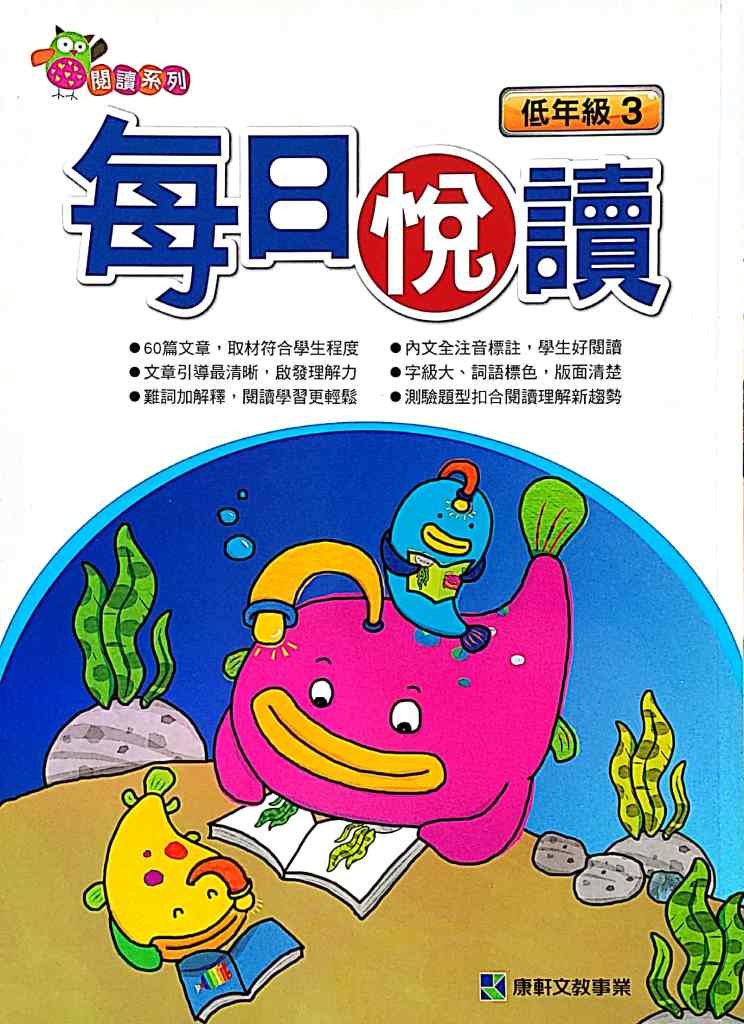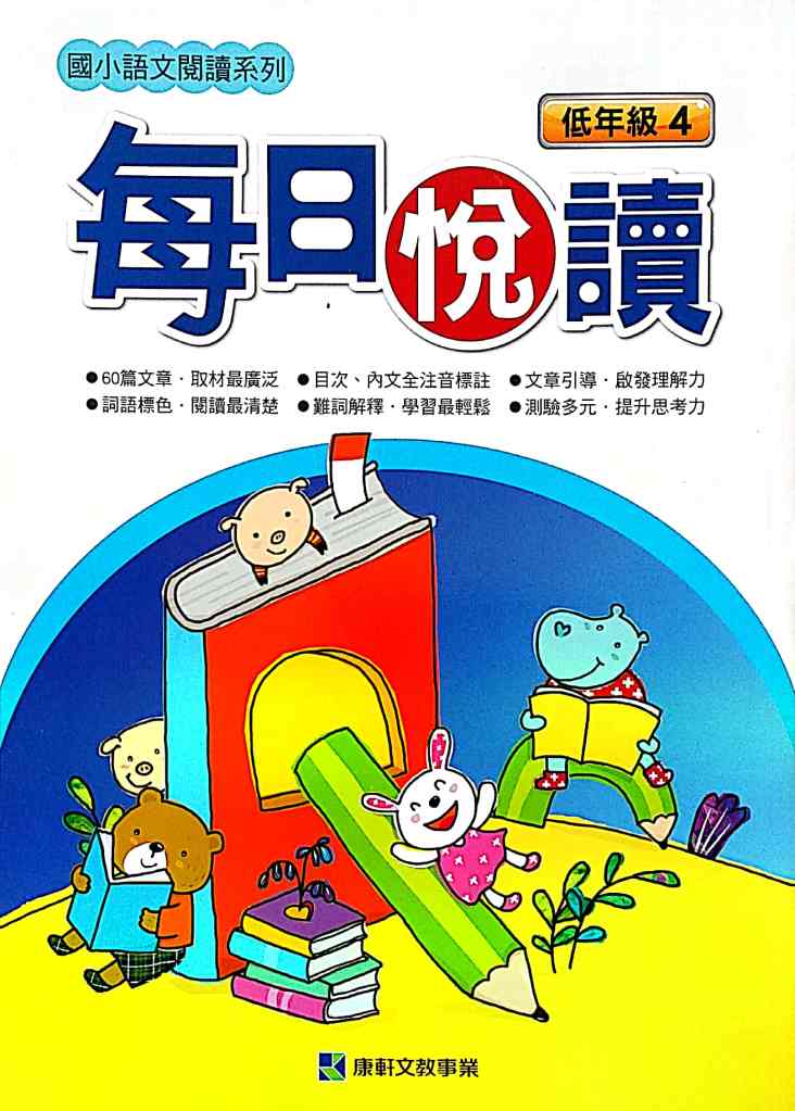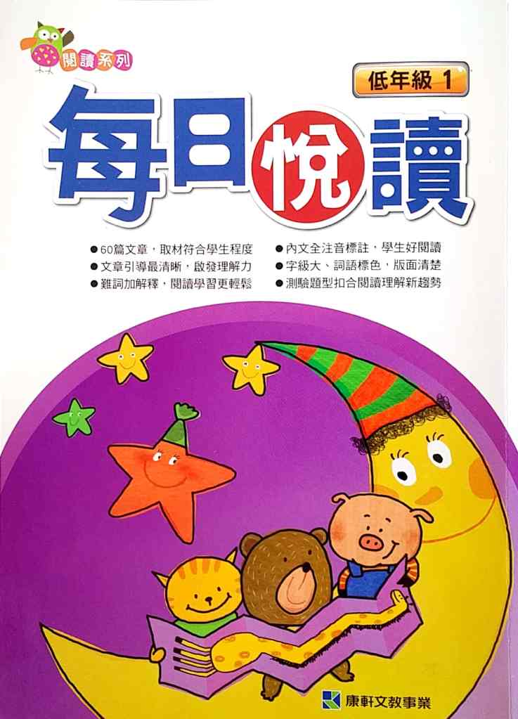 Here comes my favorite part is they always have these things where you should read one a day. There are many many many many brands of these books and we have a few brands at home too. Here’s one that’s popular from 康軒. There are four books for Lower Elementary and I start on the first book and show you what the last book last article looks like.