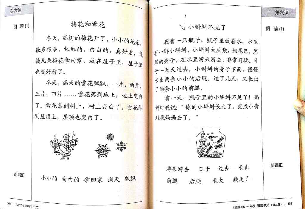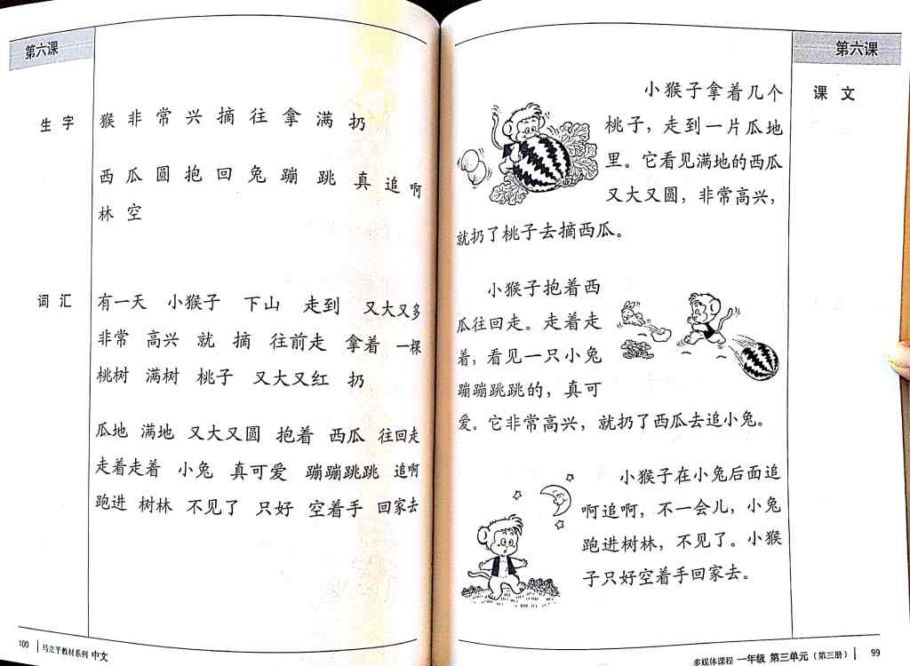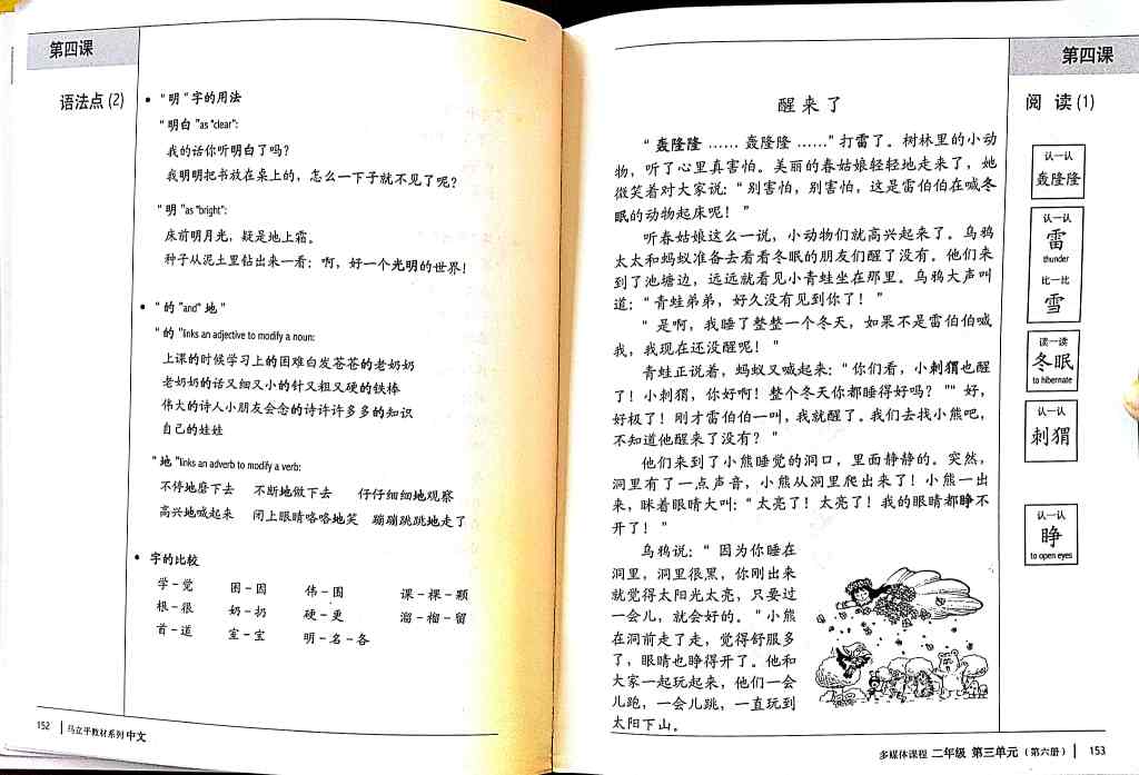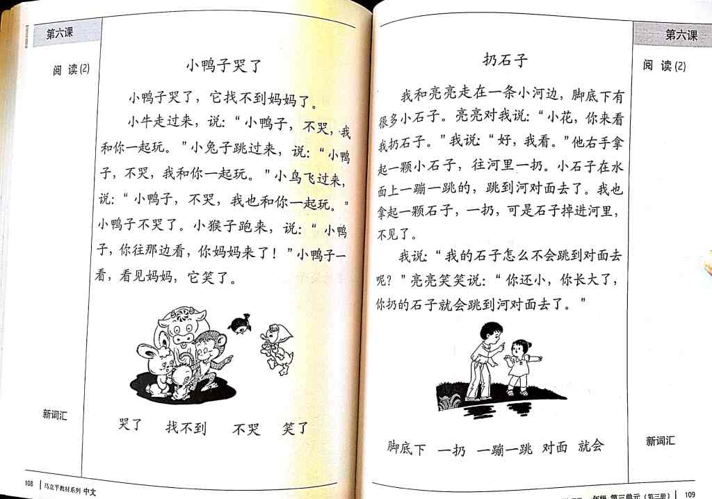 This is the last lesson of first grade. As you see, there is no pinyin assistance but then again, the words are very easy compared with curriculum in Asia. I however, already feel this is better than the other Chinese texts that are made for American children. Their second grade material is much better: