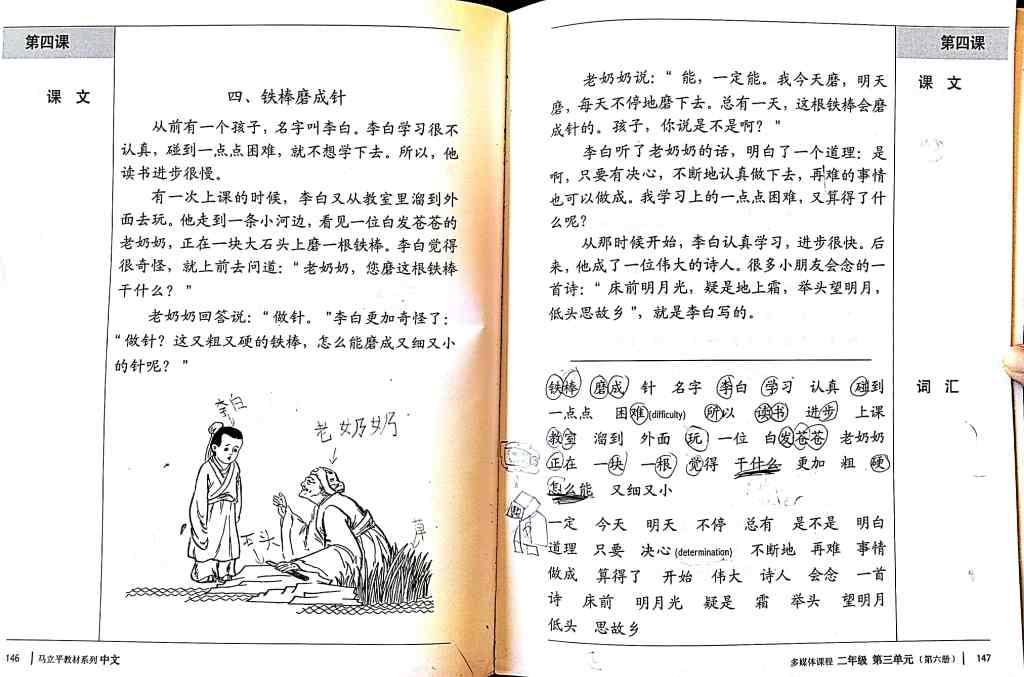 So let’s now take a look at Shanghai/China curriculum. A good friend of mine let me borrow her material to take a look at what kids in China are learning in first grade. It starts of “EASY”… and then proceeds to blow me away how much they read by the end of first grade WITHOUT pinyin. The one extra difference that people in China learn is 唐詩. They have this stuck in between every few chapters so kids all learn this during school in their formal textbooks tagged along. In Taiwan, I believe they do these in separate classes. Therefore, textbooks in China are more all in one sort of deal.