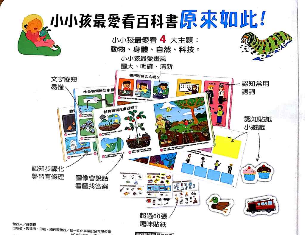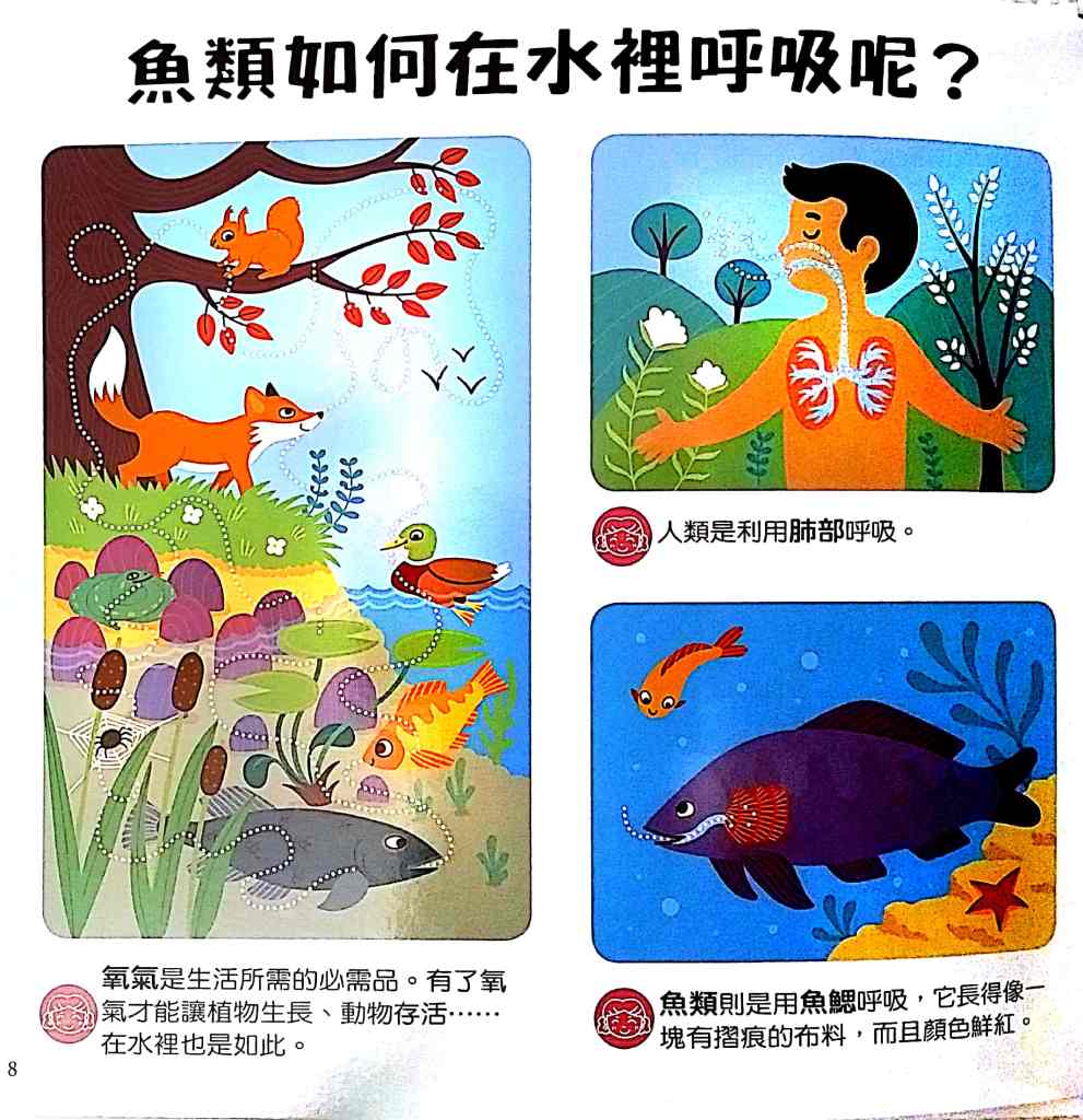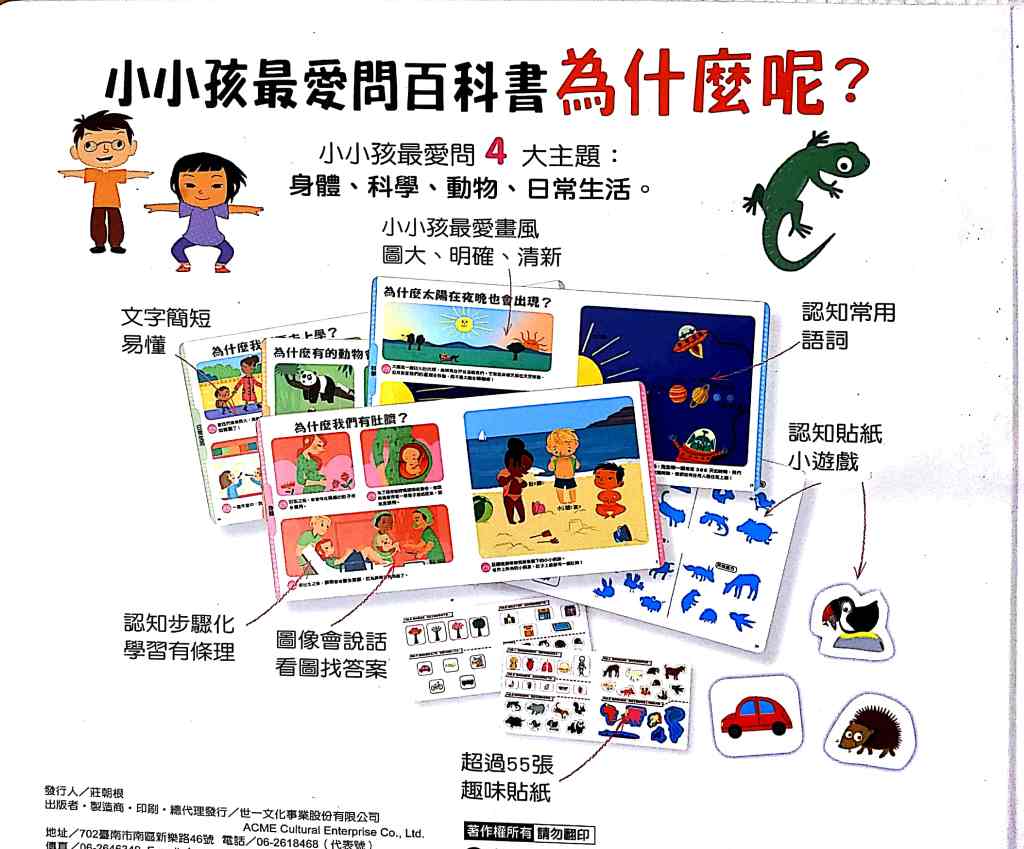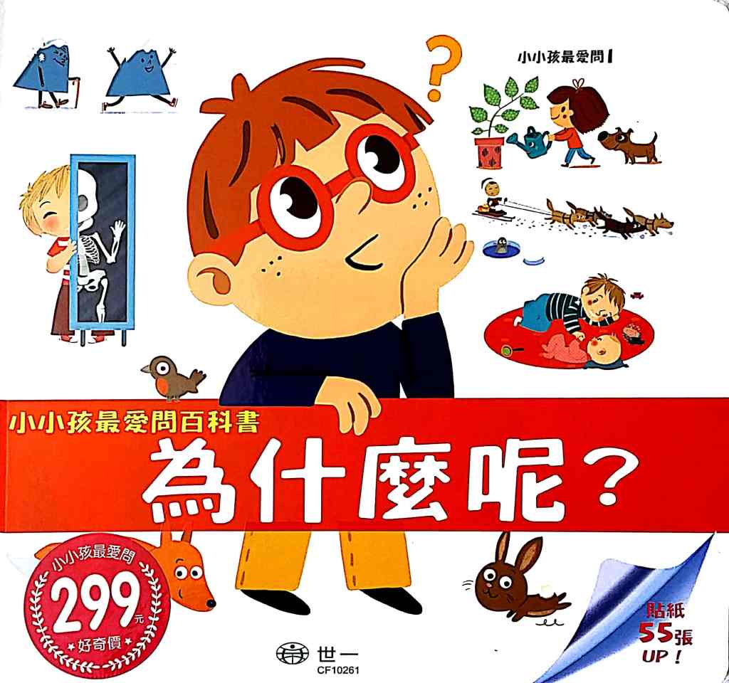 This is a book to be read wit parents who can read Chinese without zhuyin or pinyin assistance. The book is beautiful with lots of illustrations and it’s two books that asks “Why” questions and how stuff works. This set comes with 2 books with glossy card like texture on each page because in each book, they give you “stickers”!!!! Removable for you to have kids stick them where it matters in the book. Fun and kills some time. We haven’t used the stickers but my children did spend some time going through the questions and looking themselves. Lots of information and laid out really easily.