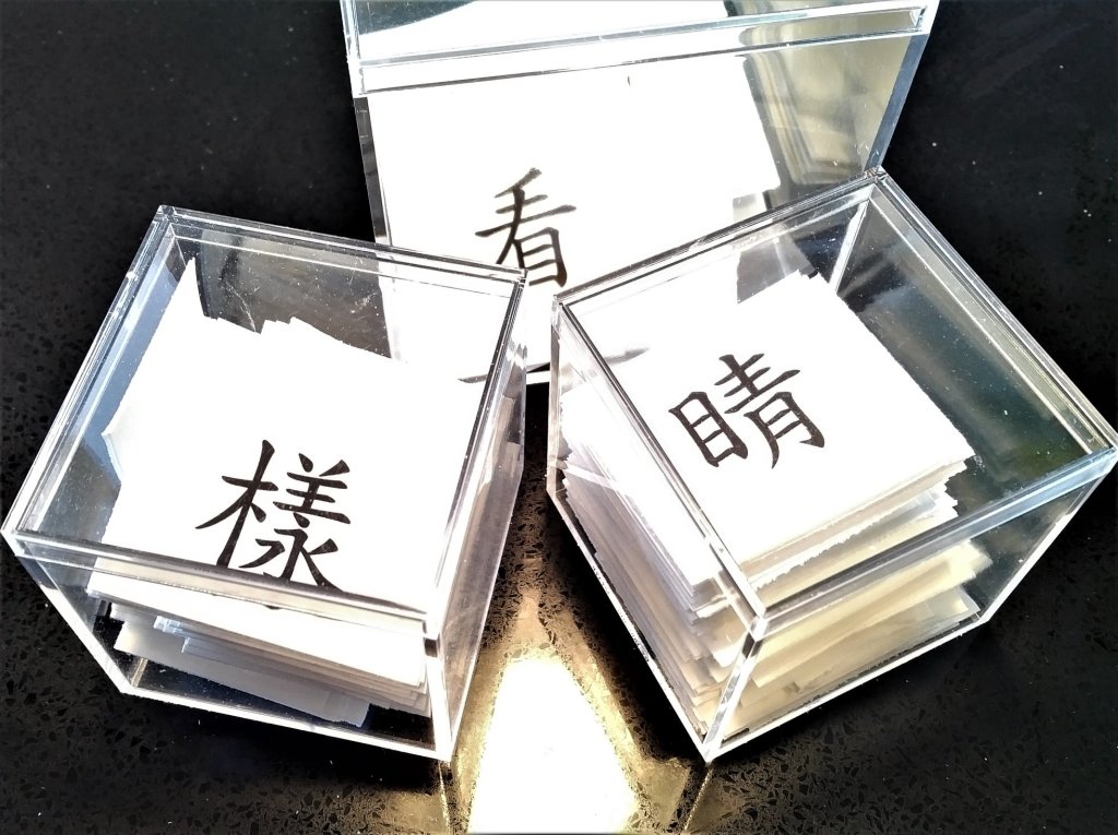 Here I printed the most frequently used 500 words on cardstock paper and then used a paper slicer and cut them up into little cube cards (not all perfect cubes but that’s okay because I wanted to do it fast). I originally wanted to let them make sentences and phrases but ended up doing a lazy person’s flashcard game instead of who can get the most cards. They each take turns to flip a card over, and if they can read it, they would deposit it in their little boxes. There’s something with kids and collecting little things in little boxes and being able to count and shake them later. Flashcards took me about an hour to slice up the 500.