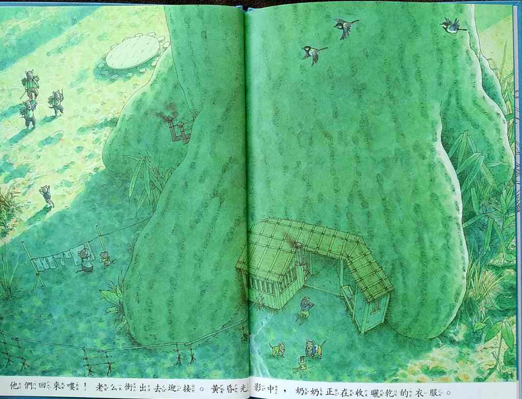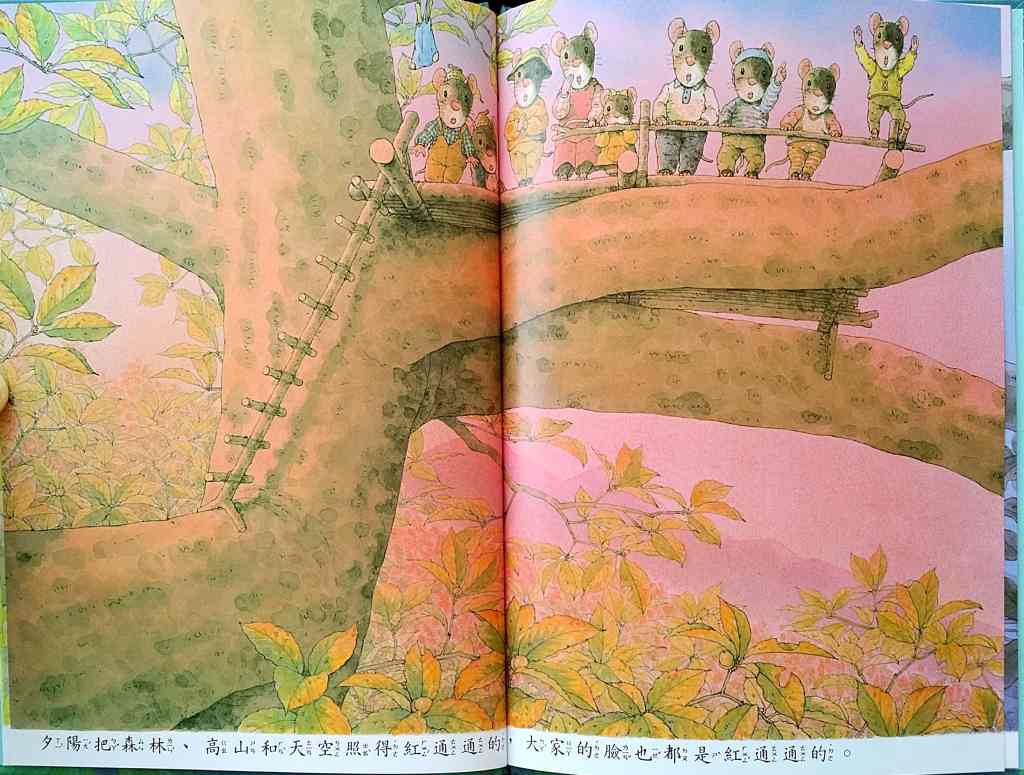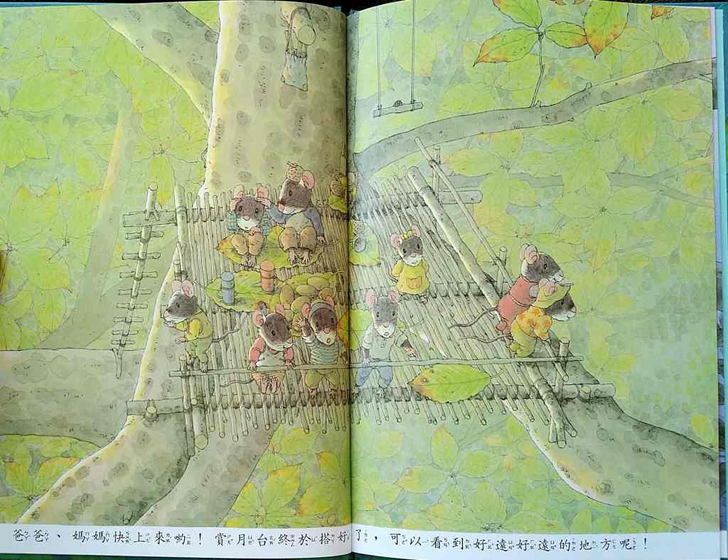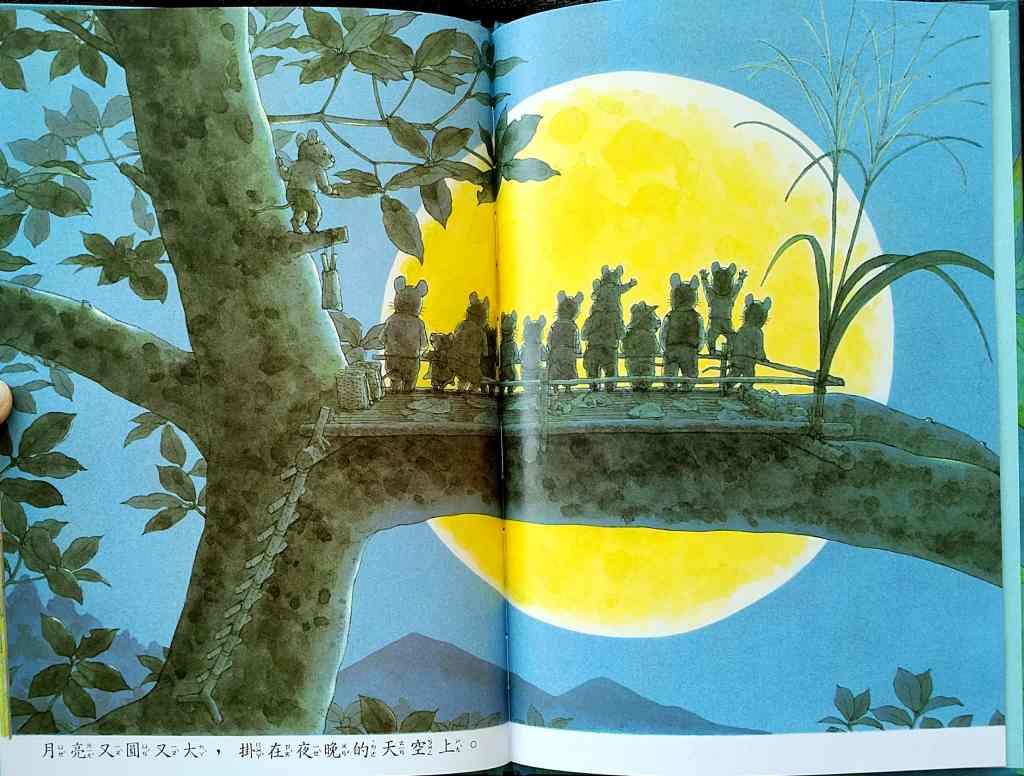 「14隻老鼠賞月」── Moon Watching 中秋滿月,家族攜祭品食物,上了高樹賞月,美好的圓月象徵老鼠以辛勞換得的美滿家庭生活。