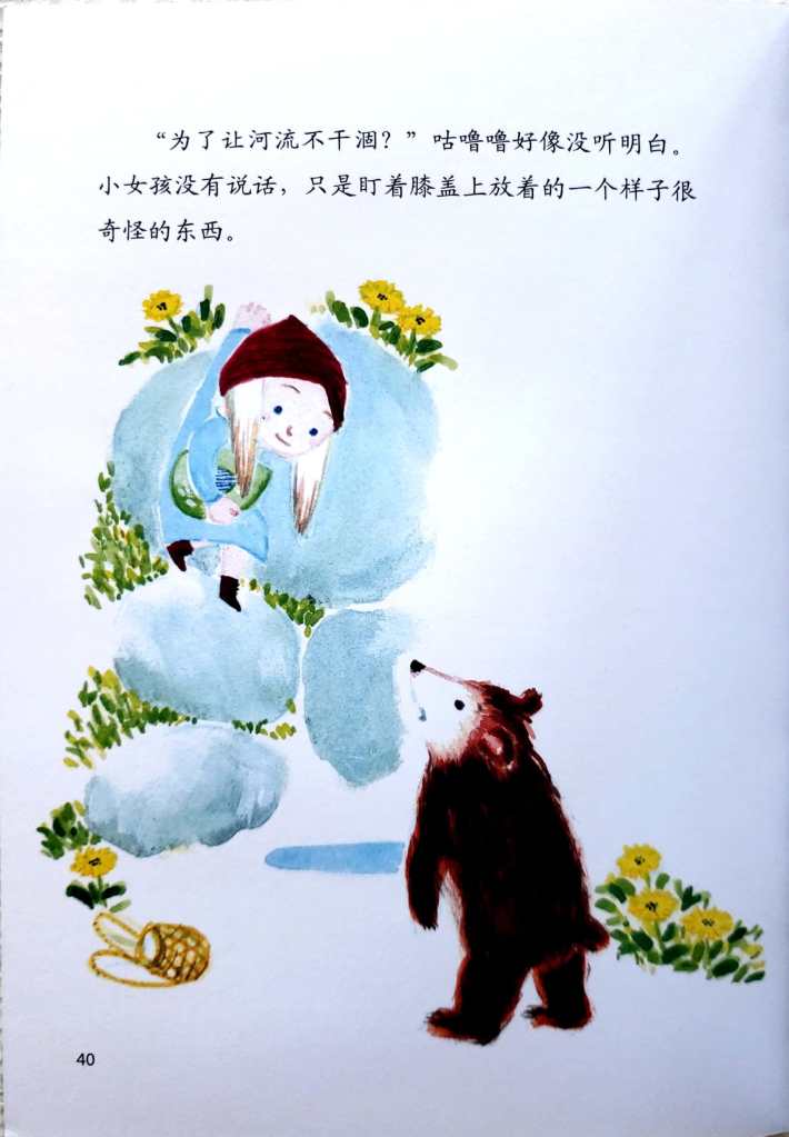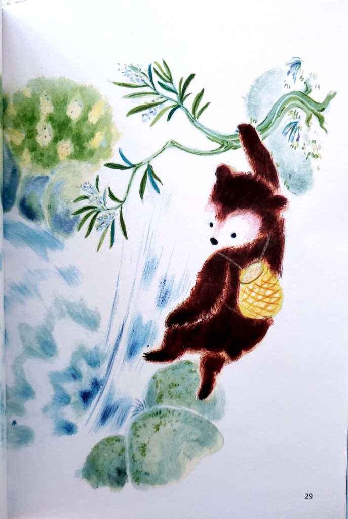 小河的秘密 is about the bear wanting to know where the water comes from. He takes an adventure to follow the river to the top only to find a water genie/fairy and when he found her, she granted him three wishes (all very practical wishes like wanting to eat something or send a letter to a friend). Then after he found the source of water, he starts to walk back home and got a little lost in the dark. This is when he found little fireflies in his backpack that will guide home. This is what the fairy/genie had left for him with her magic. He gets home safe. The end. Cute, heart warming, not a “thrilling” book per se but very appropriate for the younger crowd. Sweet and cute kind of like Winnie the Pooh.