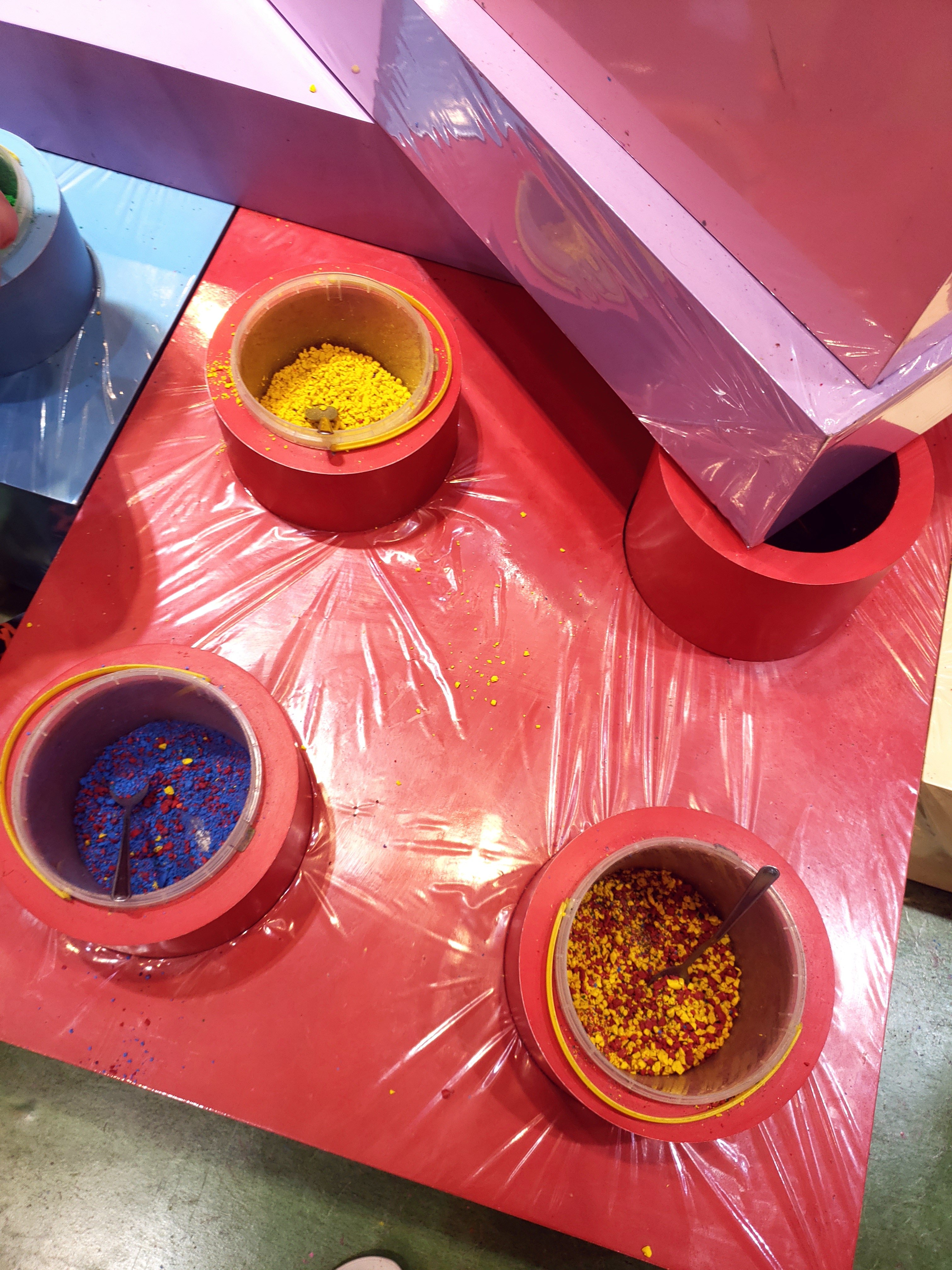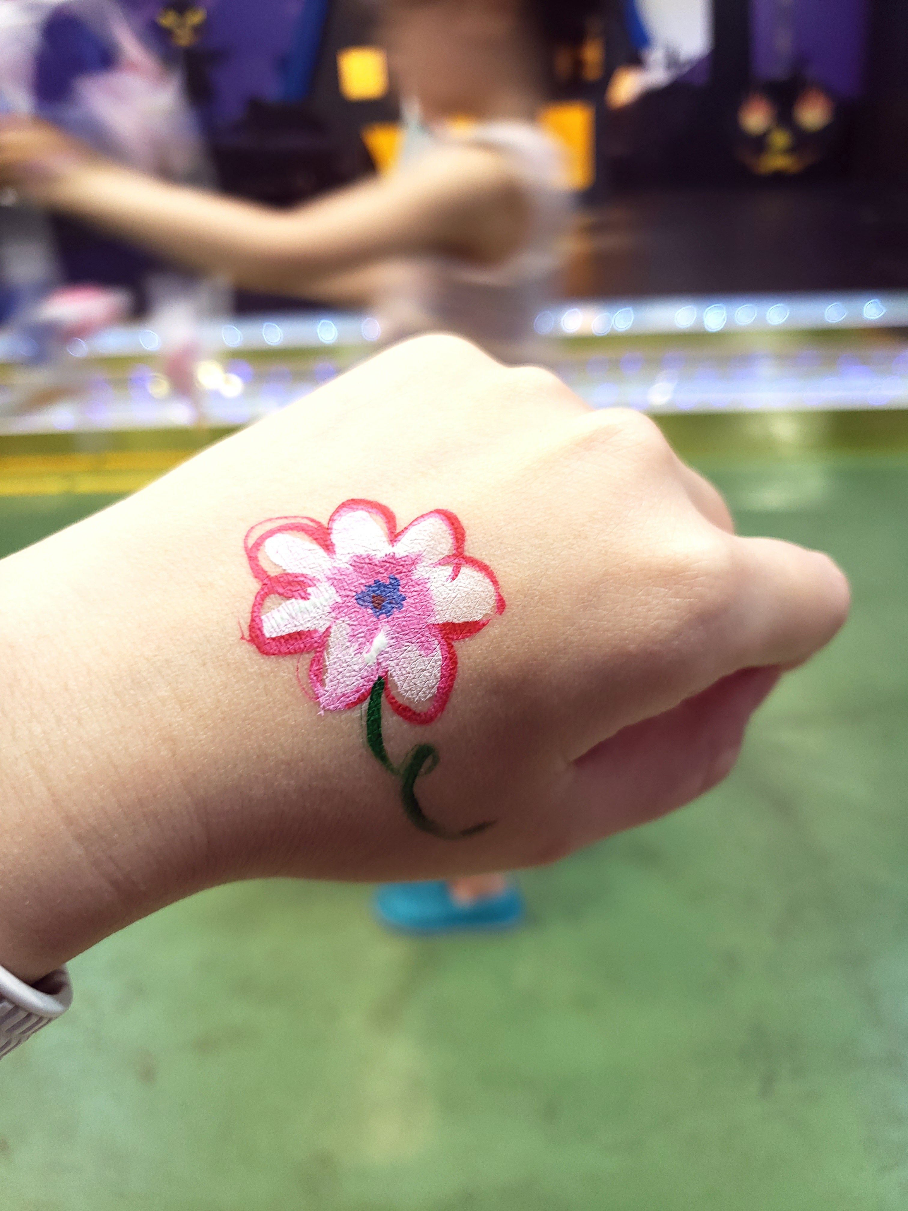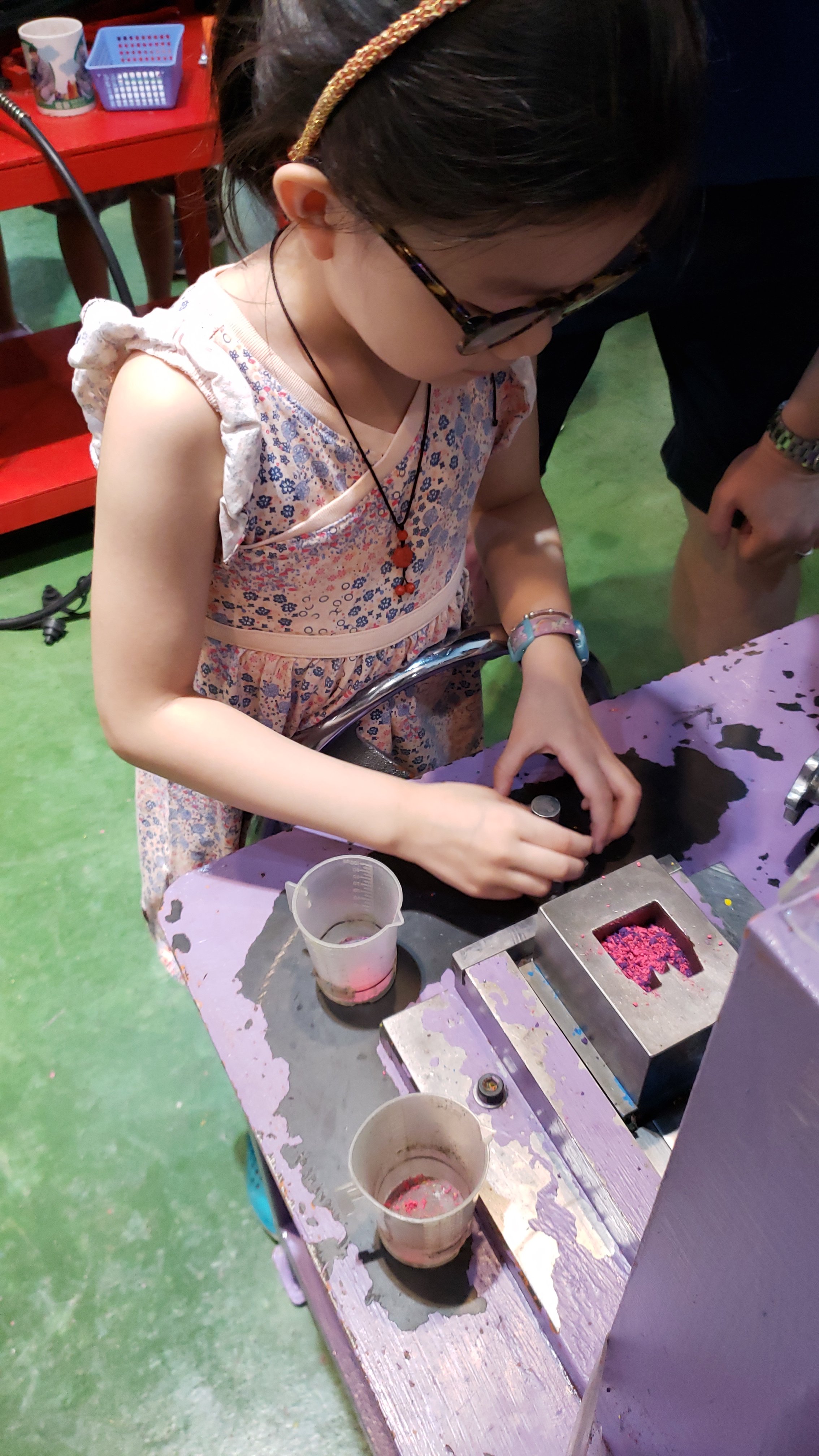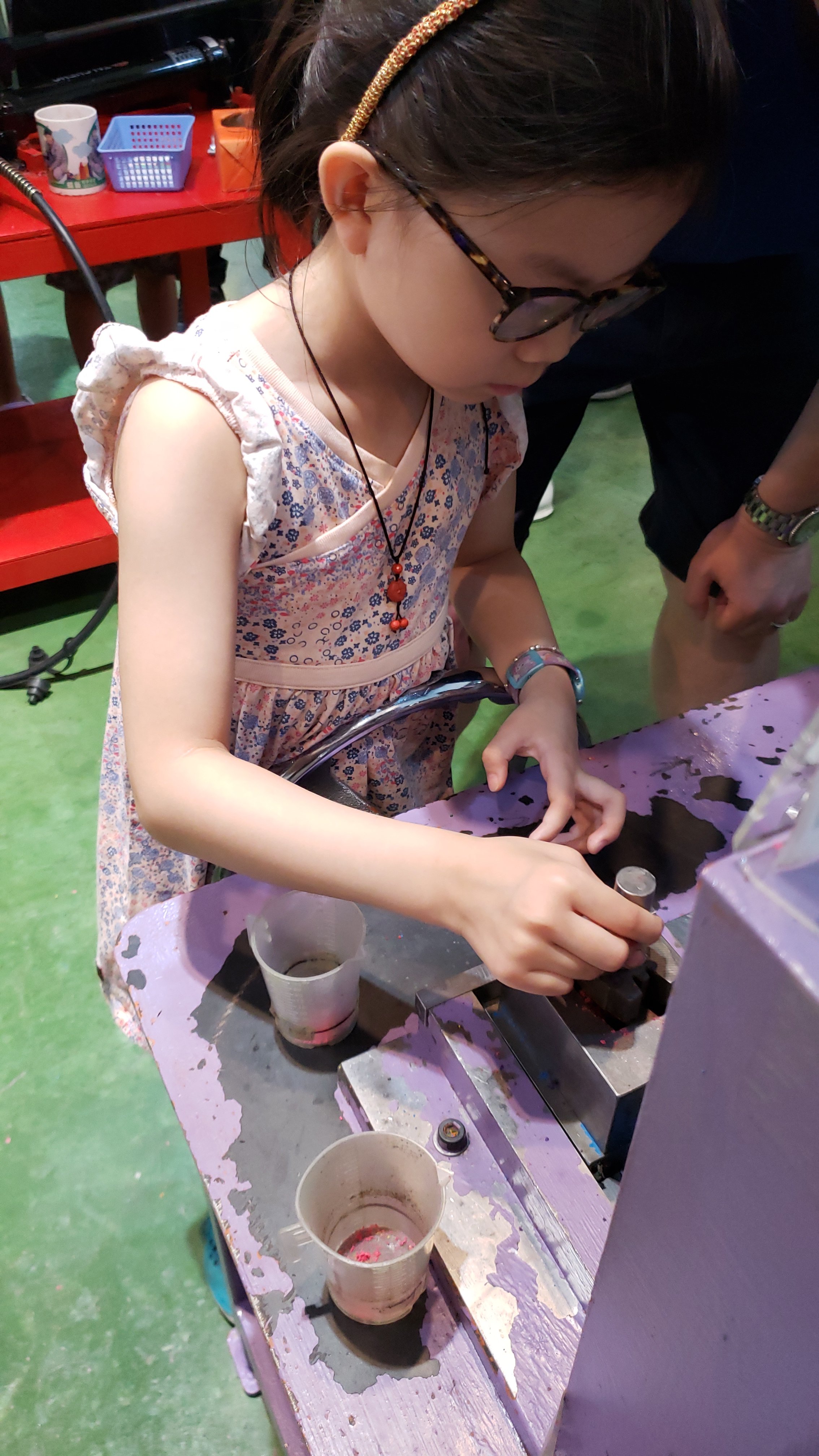 It’s a very streamlined DIY place where you do four things and you rotate through the four things within about an hour or so. You first paint and make a pinwheel, then you make a marker, then you use a pressure machine and make some crayons in castle shapes and then you do some painting on your skin or body part of choice.