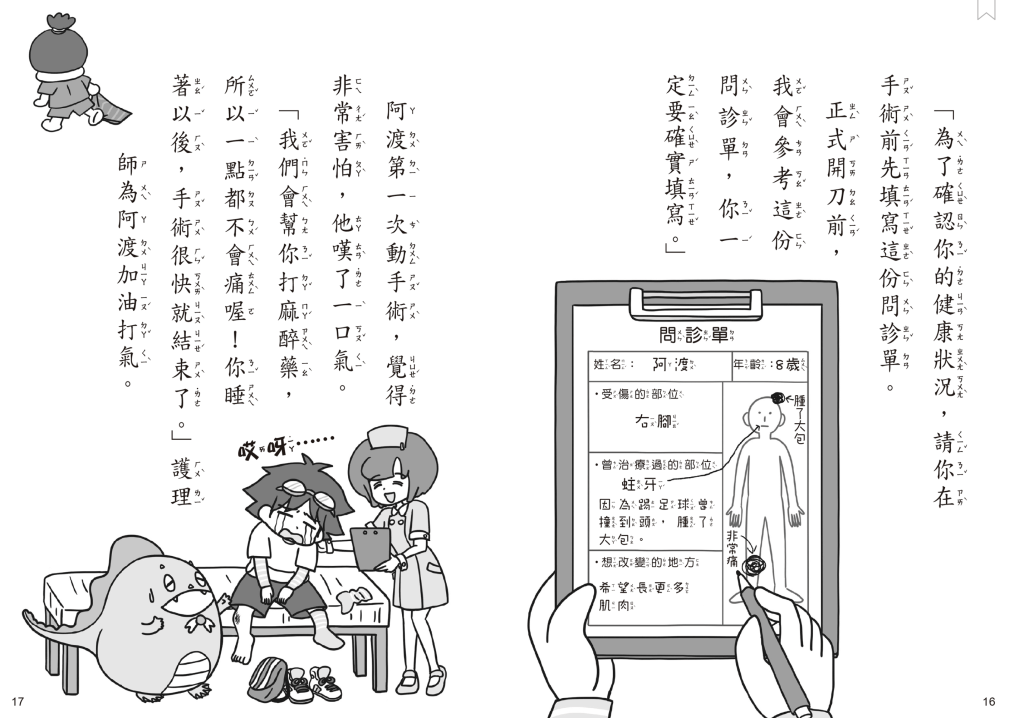 The story is very fit for both boys and girls. A boy gets hurt and essentially needs to undergo an operation where he gets turned into a monster. During the operation, you learn about different parts of the body and their functions.